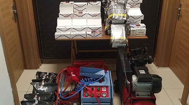 Yapılan operasyon neticesinde; 1 adet sigara sarma makinası, 1 adet hava kompresörü, 13 bin 800 adet doldurulmuş sigara, üzerlerinde bandrol bulunan 6200 adet boş makaron, 30 adet mükerrer kullanım amaçlı kesilmiş Tapdk Bandrolü üzerlerinde Bandrol Bulunan 14 Kilo Kıyılmış Tütüne ilgili karara istinaden el konuldu.