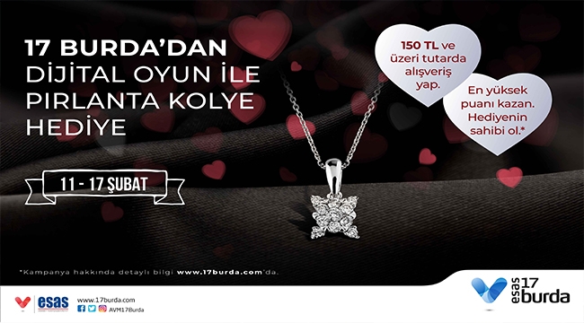 11 – 17 Şubat tarihleri arasında Esas 17 Burda AVM’den aynı gün içerinde 150TL ve üzerinde alışveriş yapan ziyaretçiler, danışma noktasında kaydını yaptırarak dijital olarak oynanacak Sevgililer Günü oyununa katılma fırsatını yakalayacaklar. Her günün sonunda en yüksek puanı alan şanslı ziyaretçisine pırlanta kolye hediye edecek olan Esas 17 Burda AVM, Sevgililer Günü heyecanını,ziyaretçilerine doyasıya yaşatacak.