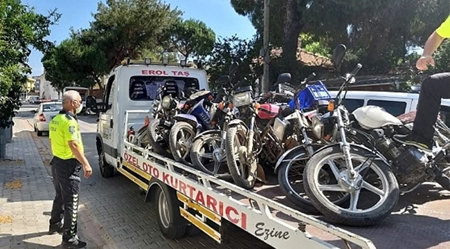 Ezine İlçe Emniyet Müdürlüğü Trafik Şubesi ekipleri tarafından, yaz aylarının gelmesiyle kullanımı artan motosikletlere yönelik ilçe genelinde uygulama yapıldı. Çevreye rahatsızlık veren ve usulsüz kullanılan plakasız motosikletlerle ilgili çalışmalarda, 23 motosikletin trafikten men edildiği bildirildi.