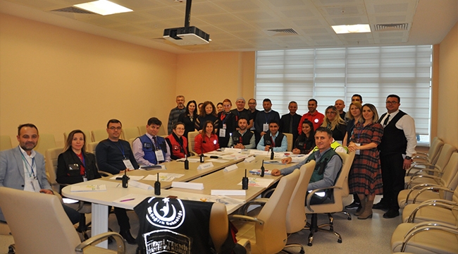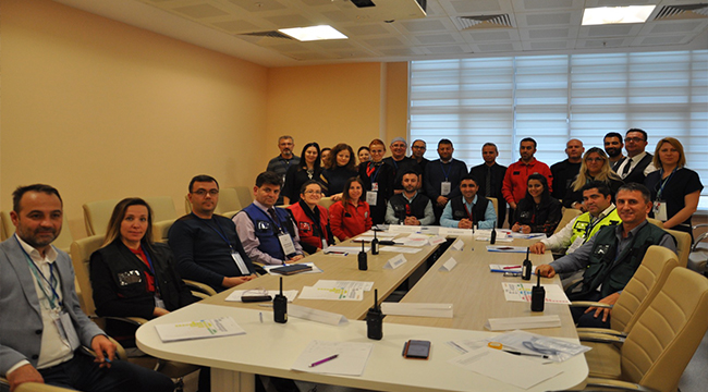 Tatbikat sonrasında toplanan Olay Yönetim Ekibi tatbikatı değerlendirirken Başhekim Ufuk Tali başarılı çalışmadan dolayı tüm ekibe teşekkür etti.