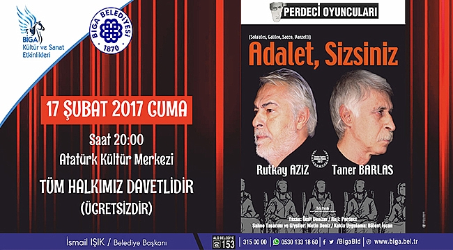 Muhsin Ertuğrul hocalarının, yazılarına “Perdeci” imzasını atmasından esinlenerek, kendilerine “Perdeci Oyuncular” adını yakıştıran Rutkay Aziz ve Taner Barlas; ilk oyunları “Adalet, Sizsiniz”i Biga Atatürk Kültür Merkezi sahnelerine taşıyorlar. Biga Belediyesi Kültür ve Sanat Etkinlikleri kapsamında 17 Şubat Cuma günü sahnelenecek oyun saat 20:00'de başlayacak.