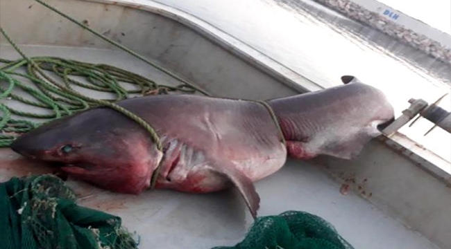 Çanakkale’nin Ayvacık ilçesinin Babakale açıklarında balıkçıların ağına 5 metre uzunluğunda 1 ton ağırlığında camgöz cinsi köpekbalığı takıldı.