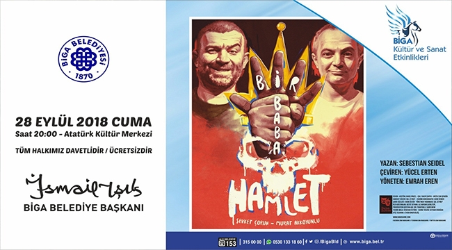 Biga Belediyesi'nin kültür ve sanat günleri kapsamında sahne alacak “Bir Baba Hamlet” Sebastian Seidel’in, komik olanın tadını çıkaran özgün metni, Yücel Erten’in usta işi çevirisi ve Baba Sahne’nin babacan yorumuyla bu toprakların tiyatro geleneğine de göz kırpıyor. Şevket Çoruh ve Murat Akkoyunlu’nun muhteşem performanslarıyla büyük beğeni topladığı “Bir Baba Hamlet”; tiyatro yapma aşkının baş döndürücü güzelliği ile aptallaştırıcı büyüsüne ayna tutuyor.