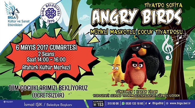 Müzikli maskotlu çocuk tiyatrosu Angry Birds, 6 Mayıs Cumartesi günü saat 14:00 ve 16:00'da iki seans olarak sahne alacak. Hakan Fidan'ın yönettiği Angry Birds'ün kareorafisi Serdar Yıldırım'a, ses, ışık ve dekoru ise Gürbey Gözden'e ait. Biga Belediye Başkanı İsmail Işık'ın tüm çocukları davet ettiği müzikli çocuk tiyatrosu Angry Birds, Bigalı çocuklar için ücretsiz sahne alacak.