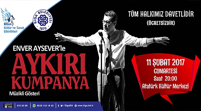 Enver Aysever, daha önce benzeri gerçekleştirilmemiş bir sahne gösterisiyle, seyirci karşısına çıkıyor. Biga Belediyesi kültür ve sanat etkinlikleri kapsamında Atatürk Kültür Merkezi'nde sahnelenecek oyun, 11 Şubat Cumartesi saat 20:00'de başlayacak.