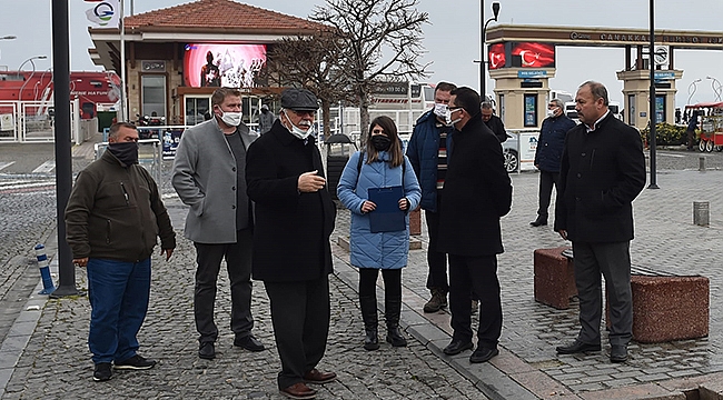 Çanakkale Belediyesi Ulaşım Hizmetleri Müdürlüğünün yürütmekte olduğu faaliyetler kapsamında, Şoförler ve Otomobilciler Esnaf Odası Başkanı Mehmet Ali Demir ve teknik ekip ile birlikte incelemede bulunan Başkan Gökhan, ticari taksi bekleme noktası planlamasına ilişkin bilgi aldı.