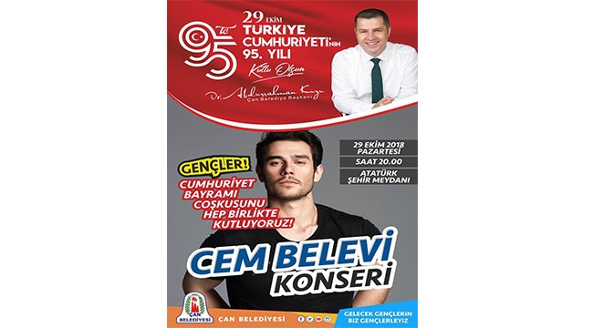 Çan Belediyesi tarafından organize edilen 29 Ekim Cumhuriyet Bayramı kutlamalarının akşamında sahne alacak ünlü popçu Cem Belevi konserinin müjdesini Çan Belediye Başkanı Dr. Abdurrahman Kuzu sosyal medya hesabından verdi.
