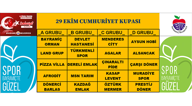 Bayramiç Belediyesi, 29 Ekim Cumhuriyet Bayramı kutlamaları kapsamında 20 takımın yer alacağı bir futbol turnuvası düzenlemeye hazırlanıyor.  Atatürk Spor Kompleksi'nde önümüzdeki hafta sonu başlayacak olan Halı Saha Açılış Turnuvası Cumhuriyet Kupası için belediye meclis salonunda kura çekimi yapıldı. Başkan Yardımcısı Ahmet Karadeniz ve Bayramiç Belediyespor Kulübü Başkanı Metin Akıncı’nın koordinatörlüğünde yapılan kura çekiminde, takımların temsilcileri fikstürü belirledi. Kuraya göre A grubunda Bayramiç Orman, Land Grup, Pizza Villa, Afrodit, Dönerci Barlas; B grubunda Devlet Hastanesi, Türkmenli Spor, Dereli Emlak, Msn Tarım, Kazdağ Emlak; C grubunda Menderes City, Agalar, Çınaraltı Pide, Kasap Levent, Öztürk Mermer ve D grubunda ise Aysun Hobi, Alsancak, Çarşı Döner, Muradiye Spor, Prestij Döner bulunuyor. Turnuvayla ilgili bilgi veren Bayramiç Belediye Başkanı Mert Uygun, “Cumhuriyetimizin ilan edilişinin 100. yıl dönümünü kutlamanın mutluluğunu yaşıyoruz. Turnuvamızın da şenlik havası içinde geçeceğine, takımlarımızın sportmence mücadele edeceğine inanıyoruz. Kazasız belasız bir turnuva geçirmemizi temenni ediyor, dostluk kazansın diyorum ve tüm takımlarımıza başarılar diliyorum” dedi.