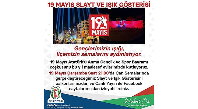 Yapılan açıklamada; "Gençlerimizin ışığı ilçemizin semalarını aydınlatıyor. 19 Mayıs Atatürk'ü Anma Gençlik ve Spor Bayramı coşkusunu bu yıl maalesef evlerimizde kutluyoruz. 19 Mayıs Çarşamba saat 21.00'da Çan semalarında gerçekleştireceğimiz slayt ve ışık gösterisini balkonlarımızdan ve canlı yayın ile Facebook sayfalarımızdan izleyebilirsiniz" ifadelerine yer verildi.