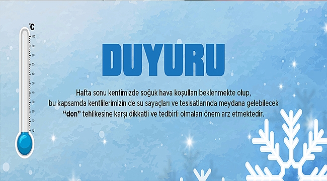 Belediyeden yapılan yazılı açıklamada, bu hafta sonu kentte soğuk hava koşullarının beklendiği, bu kapsamda vatandaşların su sayaçları ve tesisatlarında meydana gelebilecek don tehlikesine karşı dikkatli ve tedbirli olmaları gerektiği belirtildi.