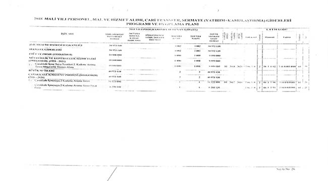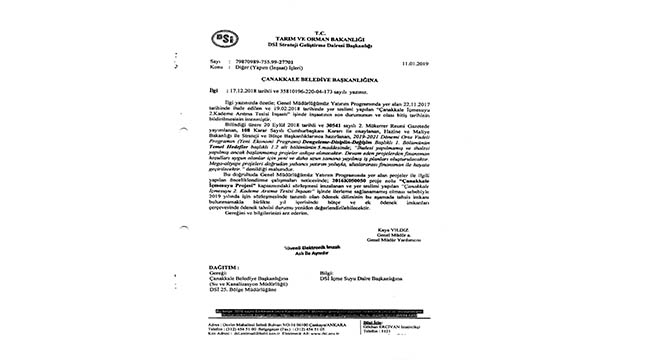 Tüm bunların yanında, 18 Şubat 2019 tarih ve 30690 sayılı Resmi Gazetede yayınlanan 767 Karar Sayılı Cumhurbaşkanı kararı ile “2019 Yılı Yatırım Programının Kabulü ve uygulanmasına dair Karar” eki 2019 YATIRIM PROGRAMI’nda yer alan DSİ Genel Müdürlüğü Devam eden Projeler Başlığı ”2019 yılından sonraya kalanlar “ alt başlığı altında yer alan 2019 yılı yatırım programında 2016K050050 proje nolu Çanakkale İçmesuyu Arıtma Tesisi tesis için ayrılan ödeneğin 50.000 TL olduğu görülmektedir. (Ek-4)