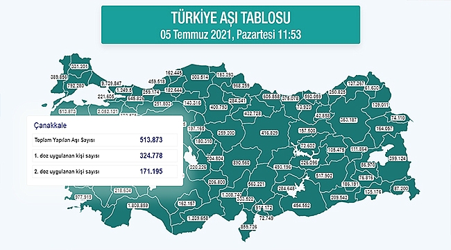 Sağlık Bakanımız Dr. Fahrettin Koca’nın yaptığı açıklamaya göre, nüfusa göre en çok aşı yapılan iller arasında % 73 aşılama oranı ile Çanakkale’miz ikinci sırada yer alıyor. İlimizdeki aşılama faaliyetleri sorunsuz bir şekilde yürütülmektedir. Vatandaşlarımızın da bu konudaki duyarlılığı ve destekleri sayesinde ilimiz nüfusuna göre aşılamada önemli bir rakama ulaştık. Aşı çalışmalarına destek veren tüm vatandaşlarımız olmak üzere, gece gündüz demeden mesai başında olan sağlık çalışanlarımıza teşekkür ediyoruz.