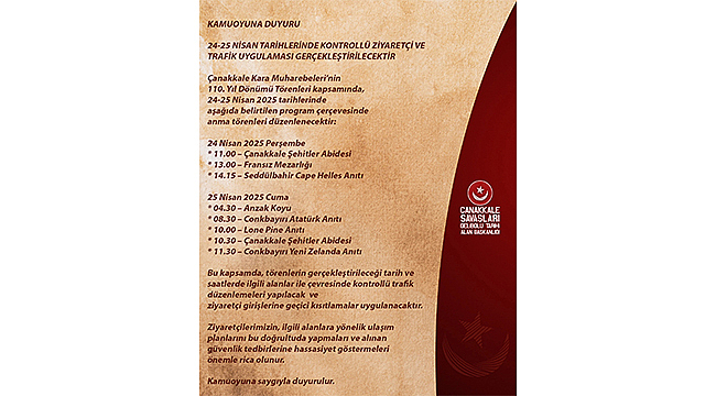 Belirtilen tarih ve saatlerde, tören alanları ve çevresinde geçici trafik düzenlemeleri yapılacak, ziyaretçi girişleri kontrollü şekilde sağlanacaktır.