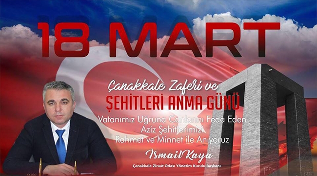 ÇANAKKALE ZİRAAT ODASI YÖNETİM KURULU BAŞKANI İSMAİL KAYA 18 MART ŞEHİTLERİ ANMA GÜNÜ VE ÇANAKKALE ZAFERİ'NİN 104. YILI DOLAYISIYLA BİR MESAJ YAYIMLADI