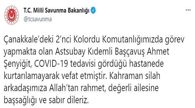 Milli Savunma Bakanlığı, Çanakkale 2’nci Kolordu Komutanlığında görev yapan Astsubay Kıdemli Başçavuş Ahmet Şenyiğit’in Covid-19 sebebiyle hayatını kaybettiğini açıkladı.