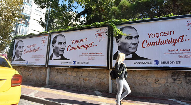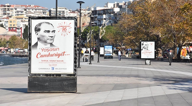 Coşkuyla kutlamaya hazırlandığımız 29 Ekim Cumhuriyet Bayramı kutlamaları kapsamında Demircioğlu Caddesi boydan boya olmak üzere kentin pek çok noktası Türk Bayrakları ve Atatürk posterleriyle donatılırken, çeşitli noktalara da Çanakkale Belediyesinin kutlama mesajları asıldı.