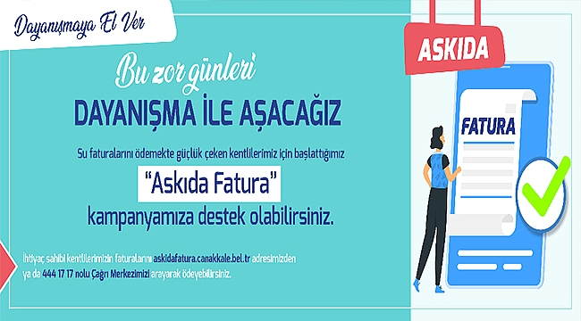 İhtiyaç sahibi kentlilerimizin faturalarını askidafatura.canakkale.bel.tr adresinden ya da 444 17 17 nolu Çağrı Merkezimizi arayarak ödeyebilirsiniz.
