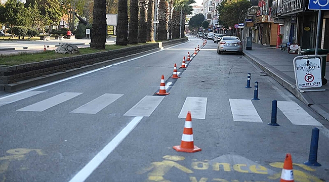 Kent genelinde trafik ve yaya güvenliğine yönelik çalışmalarını rutin olarak gerçekleştiren Ulaşım Hizmetleri Müdürlüğü ekipleri, hafta sonu gerçekleştirilen sokağa çıkma kısıtlaması ile birlikte kent içi araç trafiğinin azalması nedeni ile Demircioğlu Caddesi’nde yol çizgileri boyama ve yenileme çalışması gerçekleştirdi.