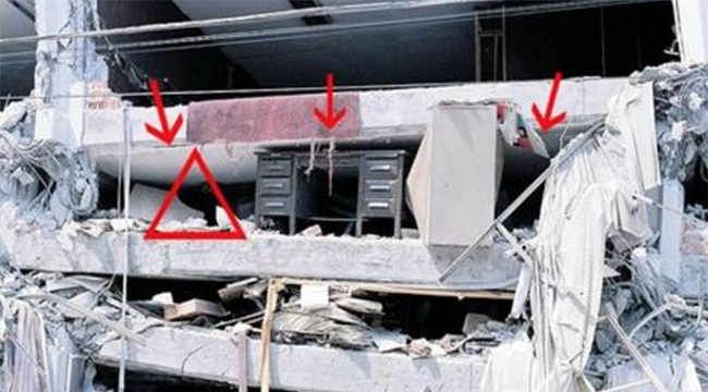 *Varsa sağlam sandalyelerle desteklenmiş masa altına veya dolgun ve hacimli koltuk, kanepe, içi dolu sandık gibi koruma sağlayabilecek eşya yanına çömelerek hayat üçgeni oluşturulmalıdır. Baş iki el arasına alınarak veya bir koruyucu (yastık, kitap vb) malzeme ile korunmalıdır. Sarsıntı geçene kadar bu pozisyonda beklenmelidir.