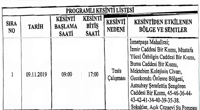 Enerji Nakil Hatlarında yapılacak bakım onarım çalışması kapsamında görselde belirtilen tarih ve belirtilen yerlerde elektrik kesintisi uygulanacaktır.