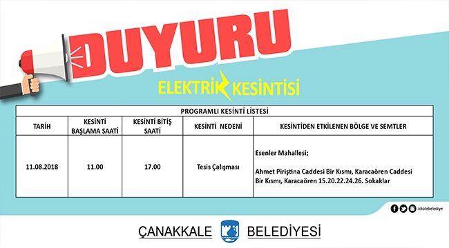 Uludağ Elektrik Dağıtım A.Ş. Çanakkale İşletme Bliğinden yapılan açıklamaya göre;