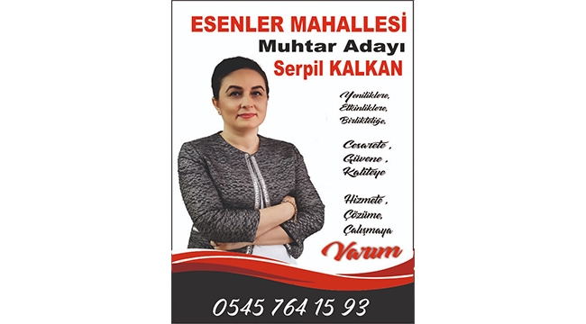Esenler Mahallesi Muhtar Adayı Serpil Kalkan Esenler'e artık kadın eli değmesinin zamanı gelmişti diyerek 31 Mart'ta sizlerin oylarını bekliyor.