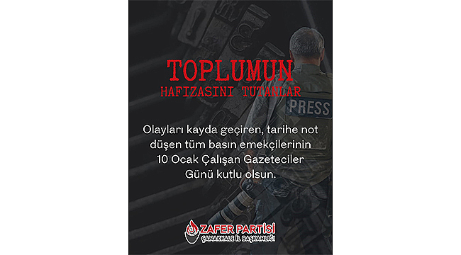 Bu duygu ve düşüncelerle, mesleğini onurla icra eden tüm basın emekçilerinin 10 Ocak Dünya Çalışan Gazeteciler Günü’nü kutluyor; Zafer Partisi Çanakkale İl Başkanlığı olarak her zaman özgür basının ve emeğin yanında olduğumuzu ifade ediyorum.
