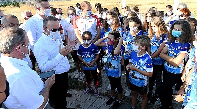 Alanda incelemelerde bulunan Turan, ardından yüzme havuzu ve spor kompleksi taleplerinin karşılık bulmasından dolayı teşekkür etmek için gelen triatlon sporcusu gençlerle sohbet etti.