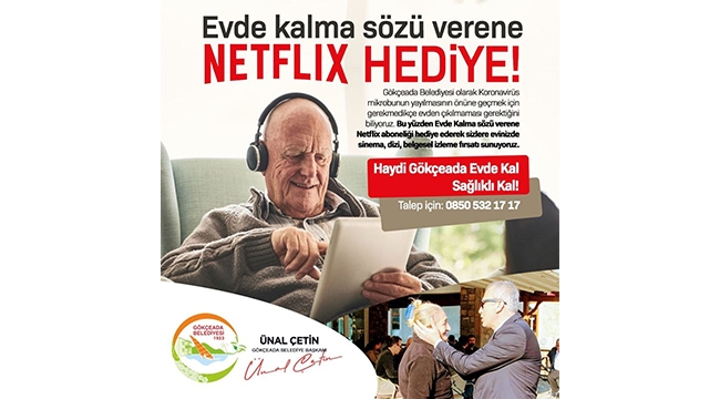 Ünal Çetin yayınladığı mesajında; "Gökçeada Belediyesi olarak Koronavirüs mikrobunun yayılmasının önüne geçilmesi için gerekmedikçe evden çıkılmaması gerektiğini biliyoruz. Bu yüzden evde kalma sözü verene Netflix aboneliği hediye ederek sizlere evinizde sinema, dizi, belgesel izleme fırsatı sunuyoruz. Haydi Gökçeada evde kal, sağlıklı kal!" ifadelerini kullandı.