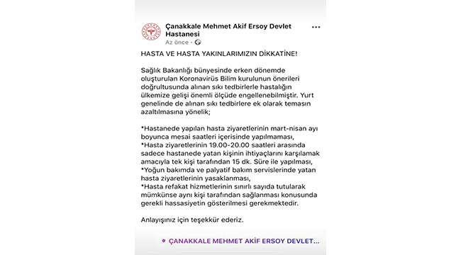 Çanakkale Mehmet Akif Ersoy Devlet Hastanesi yönetimi hazırladığı bildiride, "Hastanede yapılan hasta ziyaretlerinin Mart ve Nisan ayları boyunca mesai saatleri içerisinde yapılması,19:00 -20:00 saatleri arsında sadece hastanın ihtiyaçları doğrultusunda 15dk. ile sınırlandırılması, yoğun bakım ve palyotif bakım ünitesinde yatan hasta ziyaretlerinin yasaklanması, hasta refakat hizmetlerinin sınırlı sayıda olması hatta mümkünse tek bir kişi tarafından yapılaması gerekmektedir" denildi.