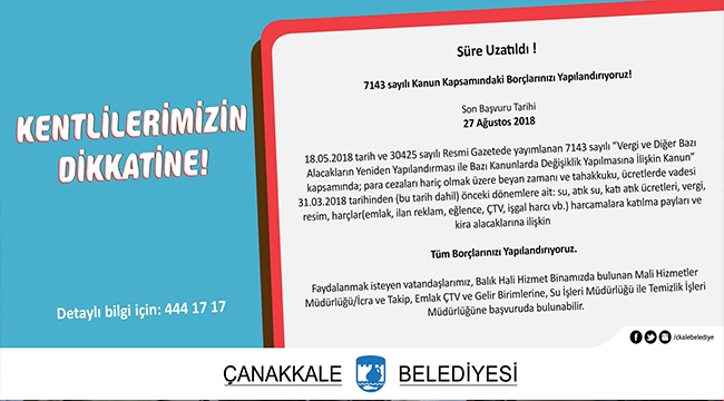 18.05.2018 tarih ve 30425 sayılı Resmi Gazetede yayımlanan 7143 sayılı “Vergi ve Diğer Bazı Alacakların Yeniden Yapılandırması ile Bazı Kanunlarda Değişiklik Yapılmasına İlişkin Kanun” kapsamında; para cezaları hariç olmak üzere beyan zamanı ve tahakkuku, ücretlerde vadesi 31.03.2018 tarihinden (bu tarih dahil) önceki dönemlere ait: su, atık su, katı atık ücretleri, vergi, resim, harçlar(emlak, ilan reklam, eğlence, ÇTV, işgal harcı vb.) harcamalara katılma payları ve kira alacaklarına ilişkin