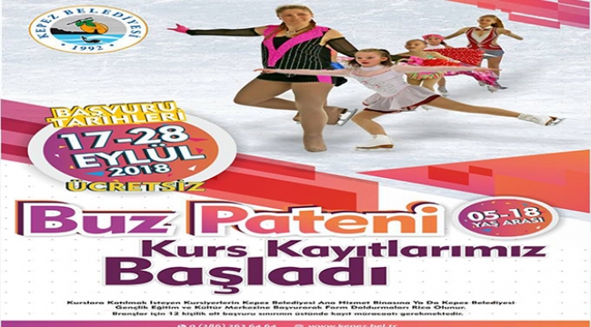Kepez Belediyesi Ücretsiz BUZ PATENİ KURSU başlatıyor.17-28 Eylül tarihleri arasında kepez belediyesi ana hizmet binası yada gençlik eğitim merkezine başvurularınızı yapabilirsiniz.