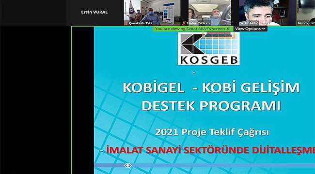 Çanakkale Ticaret ve Sanayi Odası üyeleri için 29 Nisan 2021 tarihinde online olarak düzenlenen bilgilendirme webinar toplantısında KOSGEB   Uzmanı Sedat Akay tarafından; imalat sanayi sektöründe dijitalleşme sürecine katkı sağlayabilecek yerli teknoloji geliştiricisi KOBİ’ler ile İmalat sanayi sektöründe faaliyet gösteren KOBİ’lerin üretim ve ilişkili iş süreçlerinde dijital teknolojilerden yararlanma düzeyinin arttırılmasıyla ilgili katılımcılara detaylı bilgi verildi.