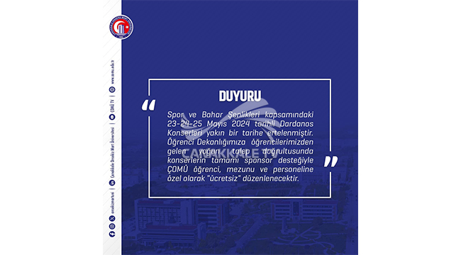 Konserlerin ertelenmesi ile ilgili Çanakkale Onsekiz Mart Üniversitesi’nden yapılan açıklamada, “Spor ve Bahar Şenlikleri kapsamındaki 23-24-25 Mayıs 2024 tarihli Dardanos Konserleri yakın bir tarihe ertelenmiştir. Öğrenci Dekanlığımıza öğrencilerimizden gelen yoğun talep doğrultusunda konserlerin tamamı sponsor desteğiyle ÇOMÜ öğrenci, mezunu ve personeline özel olarak ücretsiz düzenlenecektir” ifadeleri kullanıldı.