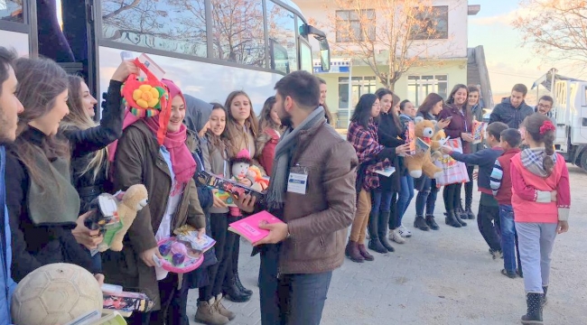 Çanakkale Onsekiz Mart Üniversitesi Halkla İlişkiler Topluluğu Çanakkale köylerinde çocuklara oyuncak, kitap, kırtasiye malzemesi ve diş macunu hediye ediyor.