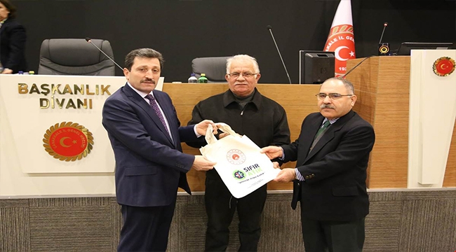 Toplantı öncesinde Çevre ve Şehircilik İl Müdürlüğünün Sıfır Atık Projesi kapsamında naylon poşet kullanımını azaltmak ve farkındalık oluşturmak amacıyla yaptırdığı bez çanta Vali Orhan TAVLI tarafından Muhtarlar Derneği Başkanı Halil Balıkçı’ya ve muhtarlara verildi.