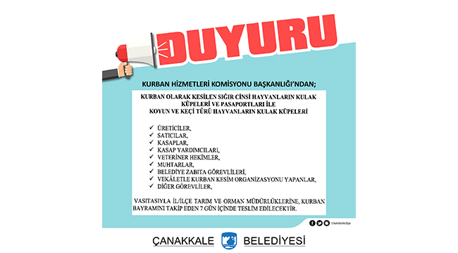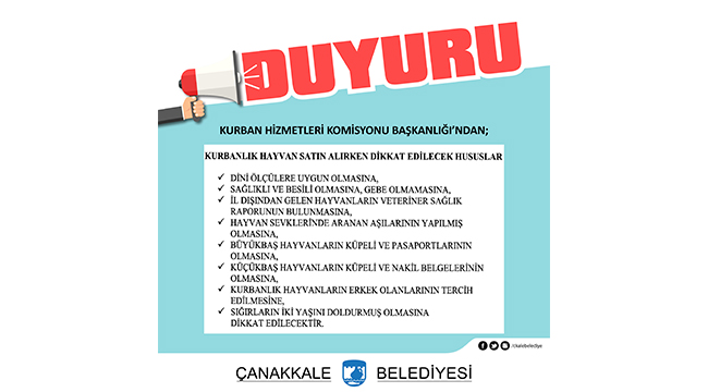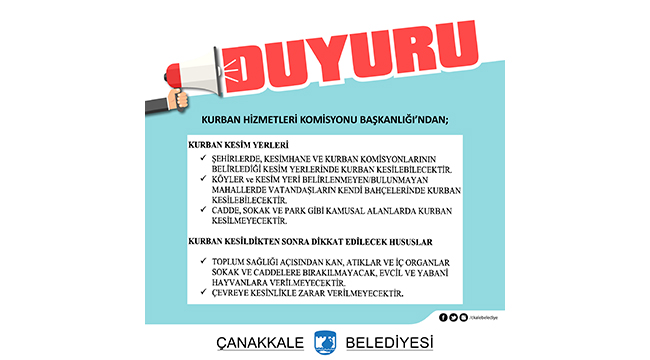 Çanakkale Belediyesi Kurban Satış ve Kesim Alanı, 19 Haziran 2023 tarihinden itibaren İsmetpaşa Mahallesi Metin Oktay Caddesi üzerinde (Eski Beton Santrali mevkiinde) hizmet vermeye başlamıştır.