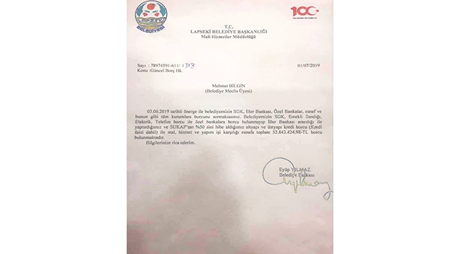CHP’li Belediye Meclis Üyesi Mehmet Bilgin tarafından talep edilen Lapseki Belediyesi’nin güncel borcu yazılı olarak kendisine tebliğ edildi.