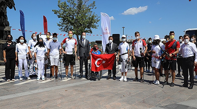 Yapılan sembolik ok atışının sonrasında Vali İlhami AKTAŞ tarafından TOKYO 2020 Paralimpik Oyunlarında Para Okçuluk Makaralı Yay Karışık Takımında gümüş madalyanın sahibi Milli Sporcumuz Bülent Korkmaz’a çiçek verildi.