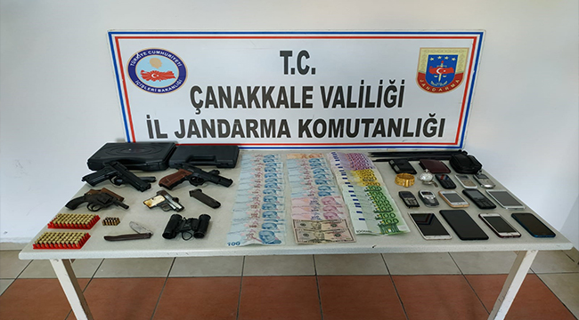 İstanbul ilinde 3 şüpheli şahıs yakalanarak Gökçeada ilçesine getirildi. Yakalanan şahısların ev ve üzerlerinde yapılan aramada; (1) adet toplu tabanca, (1) adet 25 kalibrelik Colt Automic tabanca, (2) adet kurusıkı tabanca, (3) adet şarjör, (97) adet kurusıkı tabancaya ait tabanca fişeği, (15) adet 25 kalibrelik Colt Automic tabancaya ait fişek, (1) adet köstekli saat, 5.800 EURO, 100 ABD DOLARI, 3.820 TL, (1) adet altın bilezik, (1) adet yüzük, (5) adet tuşlu cep telefonu, (5) adet akıllı telefon, (1) adet flash disk, (14) adet siyah renkli plastik kelepçe, (1) adet pasaport, (1) adet cep telefonu, (1) adet dürbün, (1) adet cüzdan, (2) adet tabanca kılıfı, (3) adet sırt çantası, (3) adet gömlek, (2) adet tişört, (2) adet pantolon, (1) adet yunan parası, (7) adet sim kart ele geçirilerek bu malzemelere adli makamlarca el konuldu.