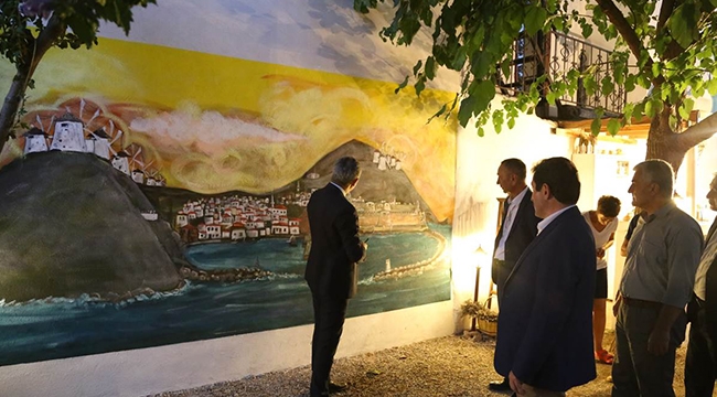 Bozcaadalı sanatçıların eserlerinin sergilendiği karma sergiyi gezen Vali Orhan Tavlı, eserler hakkında ressam Cemil Onay’dan bilgi aldı.