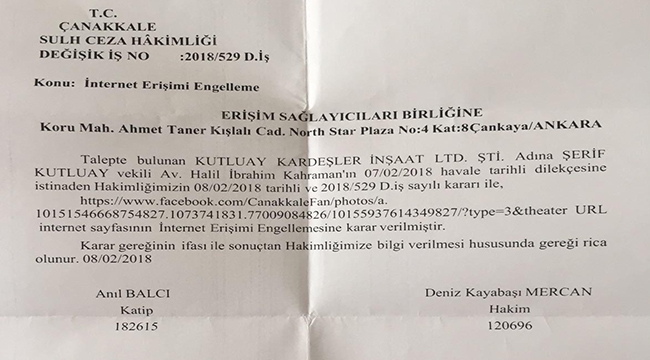 Savcılığa talepte Kutluay Kardeşler İnşaat Limited Şirketi adına Şerik Kutluay vekil Avukat Halil İbrahim Kahraman'ın 07/02/2018 havale tarihli dilekçesine istinaden kararı ile @CanakkaleFan internet sayfasının İnternet Erişimi Engellemesine karar verilmiştir.