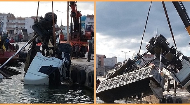 Şaka gibi görünen olay Karabiga limanında yaşandı. Kamyon akşam saatlerinde olay yerine getirilen çekici yardımı ile denizden çıkarıldı.
