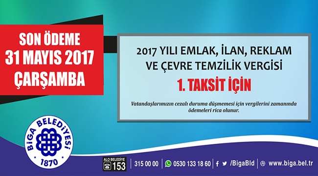 Biga Belediyesi Mali Hizmetler Müdürlüğü’nden yapılan açıklamaya göre, yılda iki dönem olarak taksitlendirilen Emlak Vergisi ve iş yerlerine ait Çevre Temizlik Vergisi ile İlan Reklam Vergisi'nin birinci taksit ödeme süresinin 31 Mayıs 2017 Çarşamba günü mesai saati bitiminde sona ereceği ifade edilerek, ödemelerin bir an önce yapılması gerektiği kaydedildi.
