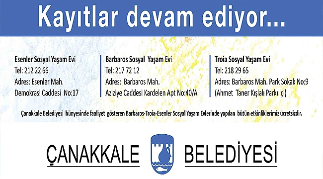 Çanakkale Belediyesi Troia, Barbaros ve Esenler Sosyal Yaşam Evleri’nde, yetişkinlere ve çocuklara yönelik düzenlenen ücretsiz etkinlikler, atölye ve grup çalışmaları için yeni dönem kayıtları 5 Eylül 2022 Pazartesi günü itibariyle başladı.