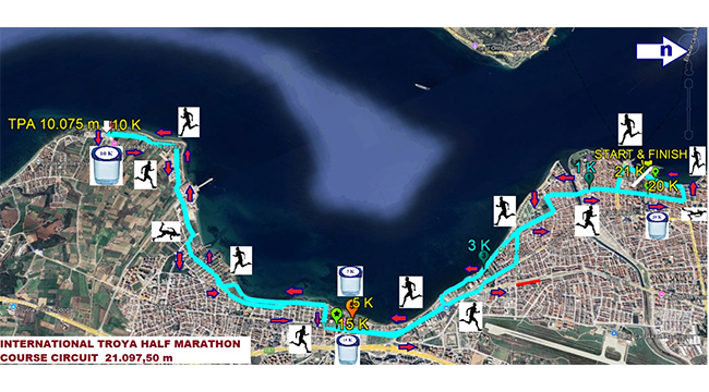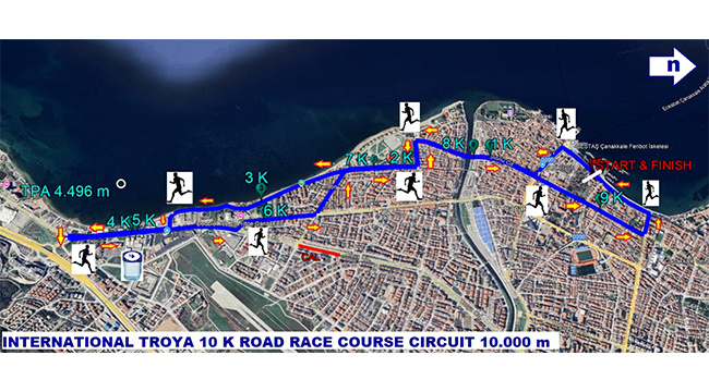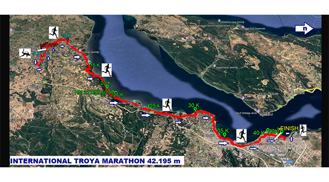 42K, 21K, 10K, 6K parkurları ve Çocuk Koşusu kategorilerinde düzenlenecek maraton; Tevfikiye Köyü Troya Ören Yeri otoparkı başlangıç noktası olmak üzere sırasıyla Tevfikiye Köy Yolu, Çıplak Köy Yolu, Çıplak Köy İçi Yolu, Tevfikiye Köy İçi Yolu, Tevfikiye–Kumkale yolu (stabilize toprak yol), Kumkale Yolu, Kumkale Köy İçi Yolu, Kumkale Şehitliği, Karanlık Liman asfalt yolu, Güzelyalı Köy İçi Yolu, Eski İzmir Caddesi, Kepez Caddesi, Kayserili Ahmet Paşa Caddesi, Demircioğlu Caddesi, İnönü Caddesi, Aziziye Caddesi, Atatürk Caddesi, İbrahim Terzioğlu Caddesi, Kepez Sahil Caddesi, 20. Sokak, İhsan Şenkartal Caddesi, Sahil Yolu Caddesi, Sahil Sokak, 100. Yıl Caddesi, Plaj Caddesi, Ziveriye Sokak ve Piri Reis Caddesi güzergâhını takip ederek Truva Atı önünde sona erecektir.
