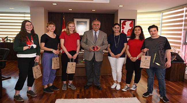 Kardeş Kent Osnabrück'tan Staj Programı kapsamında kente gelen 4 konuk stajyer, Belediye Başkanı Ülgür Gökhan'ı makamında ziyaret etti.