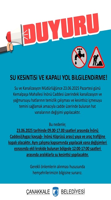 23.06.2025 tarihinde 09.00-17.00 saatleri arasında İnönü Caddesi(Aygaz kavşağı- İnönü Köprüsü arası) yaya ve araç trafiğine kapalı olacaktır. Aynı çalışma kapsamında yapılacak vana değişimleri esnasında ekli krokide bulunan bölgede 12:00-17:00 saatleri arasında aralıklarla su kesintisi yapılacaktır.