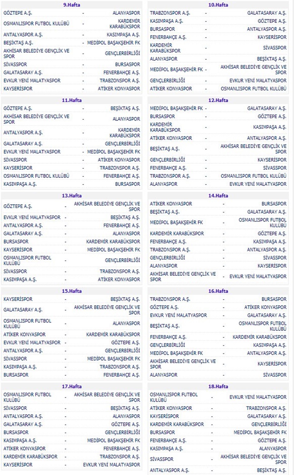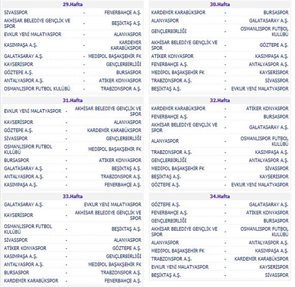 Süper Lig'de ilk hafta Beşiktaş-Antalyaspor, Galatasaray-Kayserispor, Trabzonspor-Atiker Konyaspor, Evkur Yeni MalatyasporOsmanlıspor, Göztepe-Fenerbahçe, Akhisar Belediye-Sivasspor maçları oynanacak.