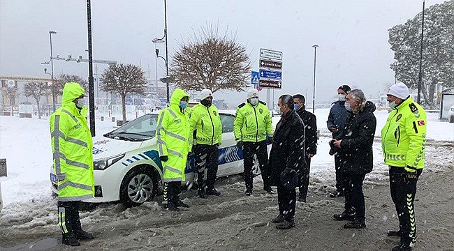 İlimiz geneleninde devam eden  olumsuz hava koşullarında iskele meydanında  görev yapan Polis devriyesini ziyaret eden Vali İlhami AKTAŞ ,  Polis uygulama noktasında alınan sokağa çıkma kısıtlaması tedbirleri ve Çanakkale’deki kar yağışına karşı alınan ulaşım tedbirlerini yerinde denetledi.